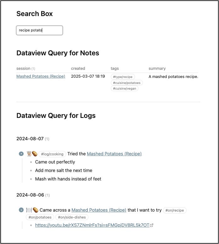 But what if you don’t want to set up a full system yet? What if you just need a quick way to search all related notes and logs? For example, you might want to search for “recipe” and “potatoes” to instantly see all notes and logs containing these terms.