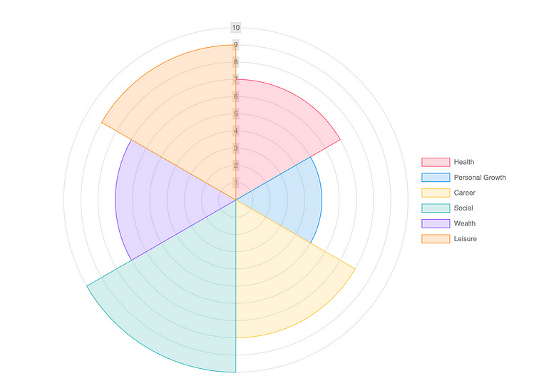 Imagine you’re sitting in front of a huge monitor, your name at the top of a PowerPoint slide, with six categories: Health, Growth, Career, Social, Wealth, and Leisure.